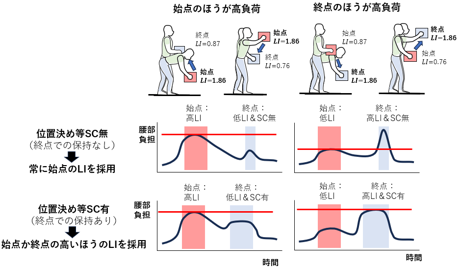 本法では、終点で位置決め等がない(SCが無)の場合は始点のLIを採用し、SCがある場合は始点と終点のLIの大きいほうを採用する。従って、SCの有無により、始点と終点のいずれの作業条件を改善すべきかを変える必要がある。下図はその様子を示したものである。